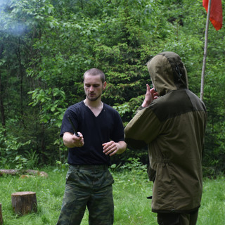 Перед началом основной части занятий и тренировкой участники как следует размялись , причем, разминка содержала элементы требующие выносливости, физической силы, концентрации внимания и внутренней собранности, что было сложно сделать по началу, так как природа располагала к отдыху, а масса лесных голодных комаров напоминала, что без движения все открытые части тела мгновенно покроются жужжащей массой и участникам волей-неволей, приходилось включаться в активные разминочные движения.