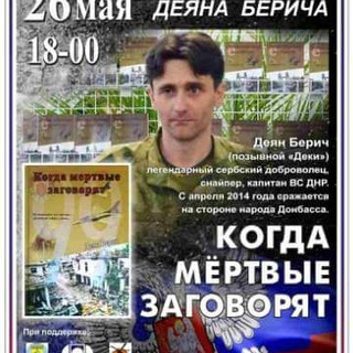 Деян Берич , знаменитый сербский доброволец Донбасса, снайпер, капитан армии ДНР (позывной «Деки»), родился 25 сентября 1974 года в г.Белграде, сразу послед рождения его семья переехала в сербское село Путинцы. У Деяна есть сын 18 лет. Впервые Деки взял оружие в руки в 17 лет и, не доучившись, пошел защищать свое Отечество-Сербию.- В 90-х годах он прошел все югославские войны. Далее принимал участие в в 3-ей обороне Севастополя, в составе группы "Северный ветер". С апреля 2014 года - Деян Берич с позывным "Деки" защищает Донецкую Народную Республику. Он непосредственный участник боёв во вех знаковых точках на войне в Донбассе: Славянск, Саур-Могила, Дебальцево, Авдеевская промзона, Марьинка, Донецкий аэропорт и многие другие. Получил 3 ранения. До своего третьего ранения в глаз служил в составе снайперского подразделения спецназа армии ДНР и работал на выявление и подавление огневых точек иностранных наемников, использующих Донбасскую землю в качестве полигона.